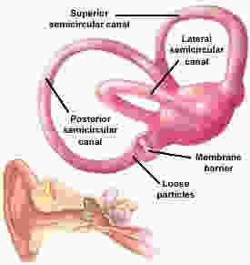 BPPV is a mechanical problem in the middle ear. It occurs when some of the calcium carbonate crystals (otoconia) that are normally embedded in gel in the inner ear become dislodged and migrate into one or more of the 3 fluid-filled semicircular canals, where they are not supposed to be. When enough of these particles accumulate in one of the canals they interfere with the normal fluid movement that these canals use to sense head motion, causing the inner ear to send false signals to the brain.